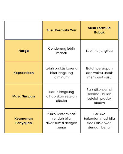 Selain itu, masa simpan susu formula cair umumnya juga lebih pendek daripada susu bubuk. Ini bisa jadi pertimbangan Ibu jika si Kecil memiliki kebiasaan minum susu yang rutin.